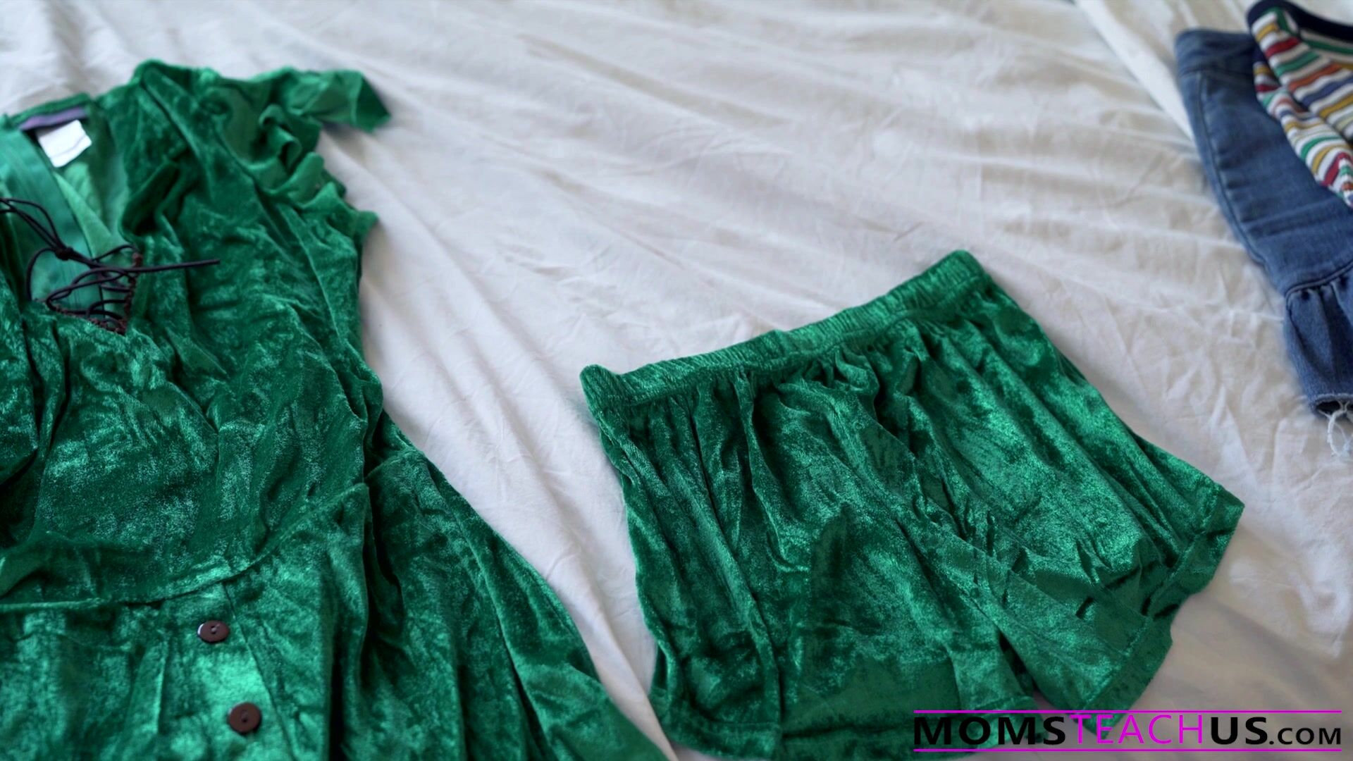 After giving her daughter a lot of grief about fooling around with her brother, Kit seduces her stepson and fucks him wearing a green fairy costume. She bends over on the couch so her son tag her from behind. Things get particularly interesting when Natalie walks in to see her mom and brother fucking, she feels betrayed and left out, threatens to rat out the family secret to her father. But Kit lets her join the Halloween fuck session and teaches her stepson and daughter how to fuck real good to make up for it.